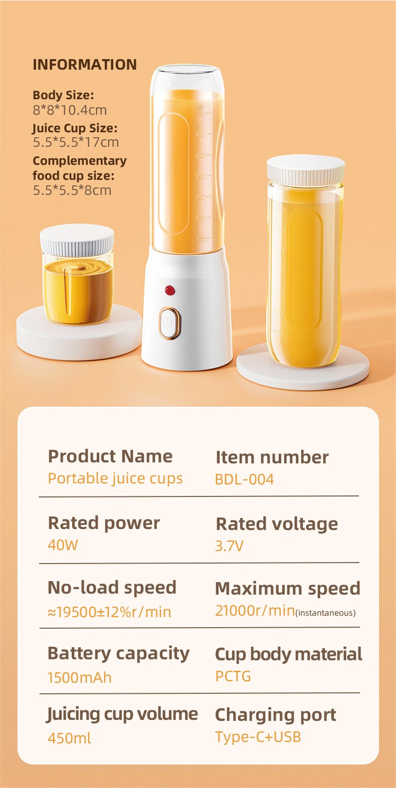 | Package Includes | Main Unit, Juice Cup, Juice Cup Lid, Baby Food Cup, Charging Cable, User Manual |